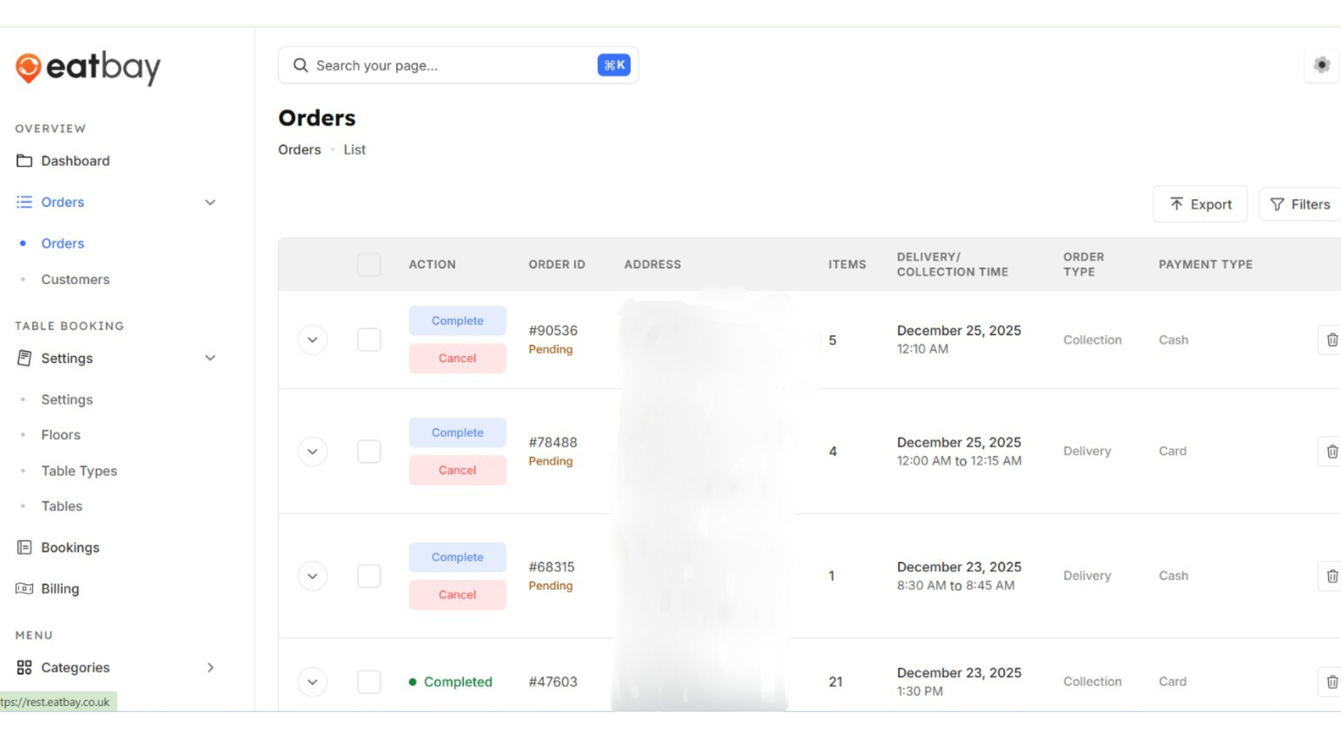 A: Yes. Each order shows its current status such as Pending, Accepted, Preparing, Completed, or Cancelled.